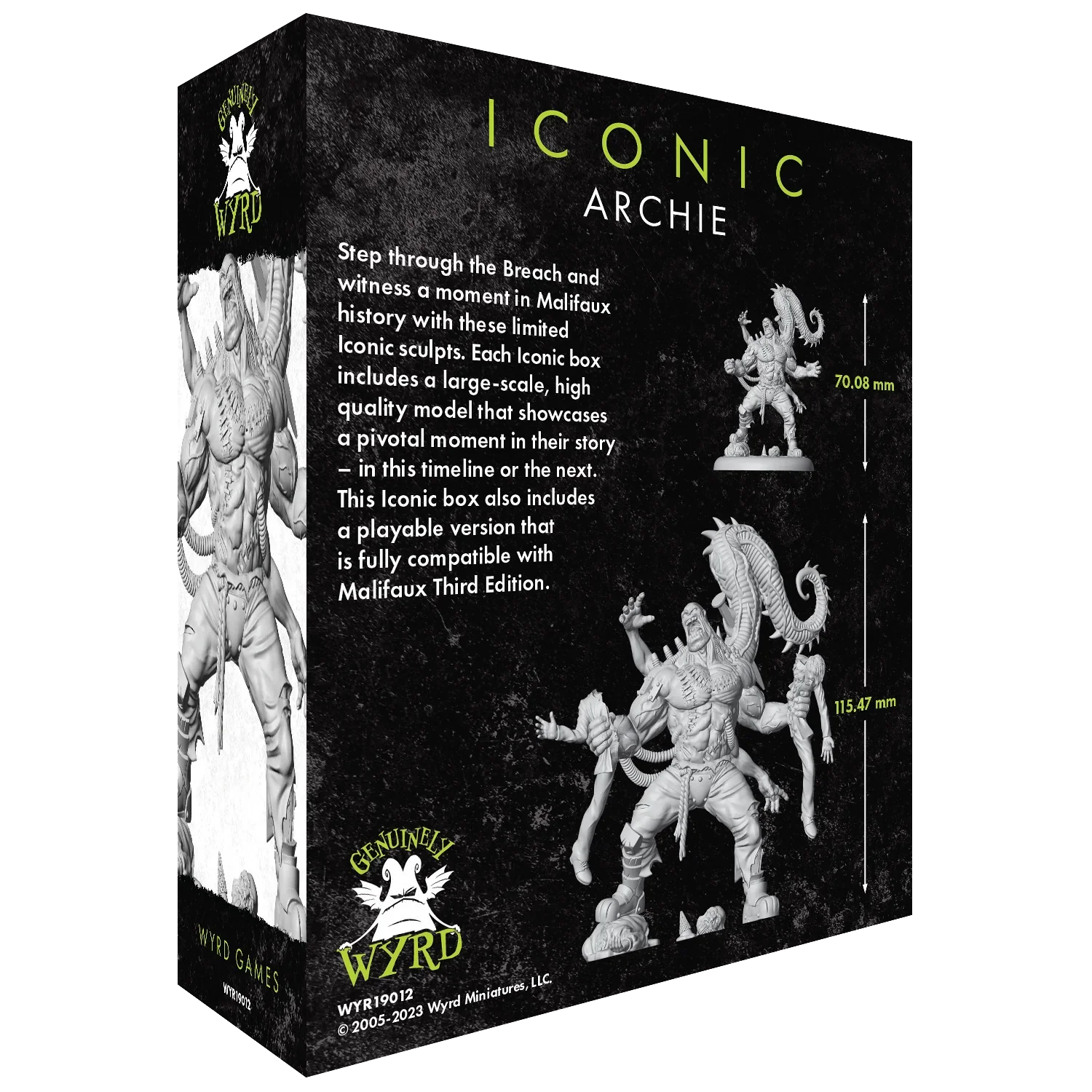 Included in this Iconic box is Archie, standing impressively at 115mm. This model will come unassembled in hard PVC so that the fine details will be kept without the complexity of building a large model. Additionally, a preassembled playable version of the sculpt will also be included so that you can field a smaller version of Archie in your next game of Malifaux.