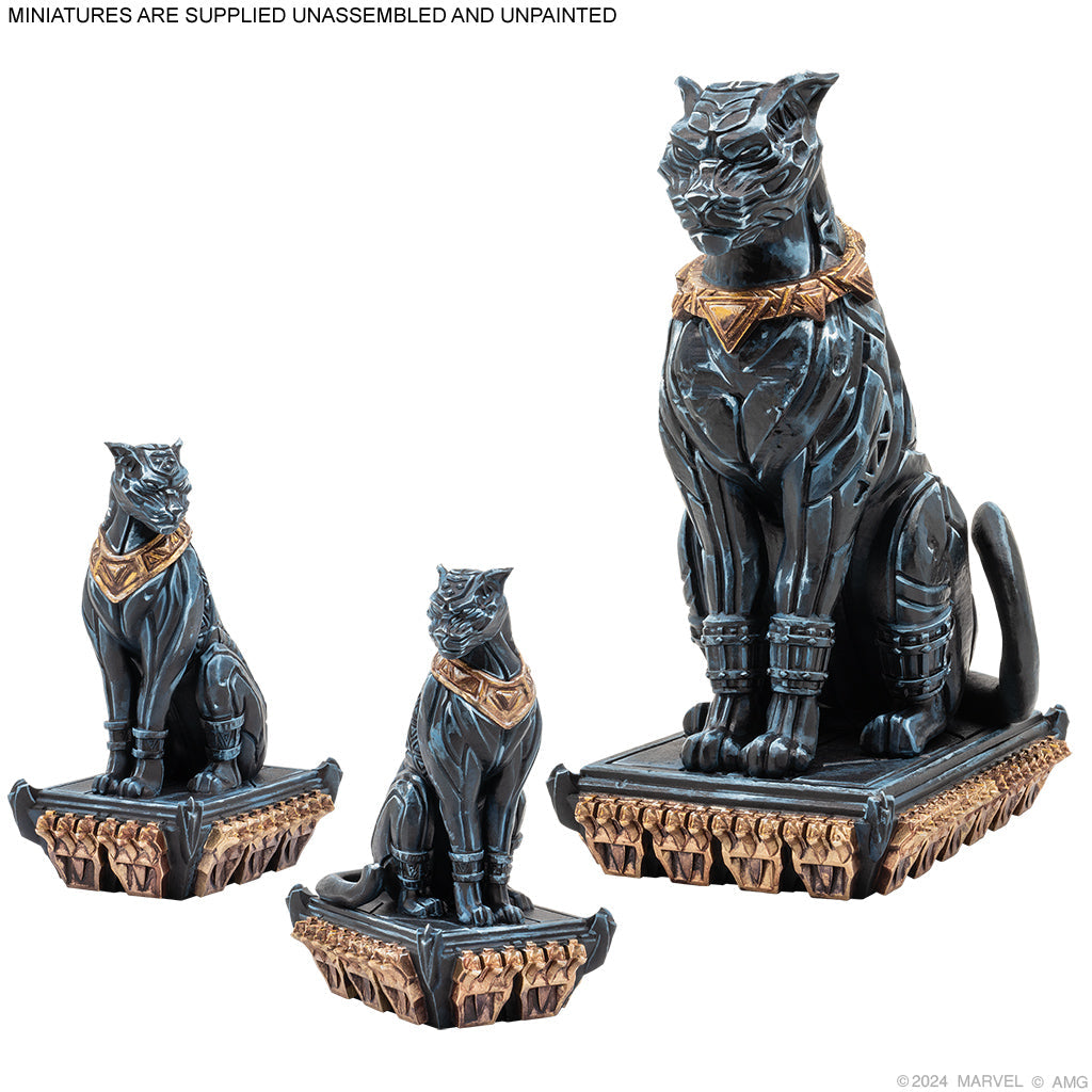 Players can add even more Wakanda-themed terrain to their Marvel: Crisis Protocol battlefields in this new pack! Great statues of panthers honoring Bast and Wakanda's royal line are erected throughout this proud nation, and this pack brings a variety of these statues to the tabletop. Featuring a large panther statue, two small panther statues, and a panther fountain, this pack gives players even more terrain to make Wakanda the backdrop for their Marvel: Crisis Protocol battles. Rounding out the pack is a One-Shot Card that invites players to modify their Crisis into a unique scenario focusing on the terrain in this pack.