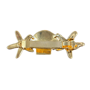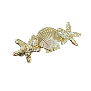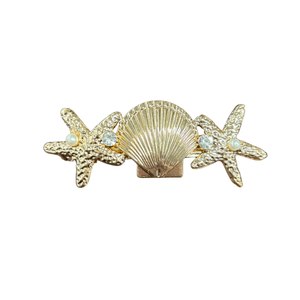 Celebrate the sea with this classic gold hair clip featuring two sea stars or starfish flanking a pretty shell, adorned with two rhinestone and two pearl accents.