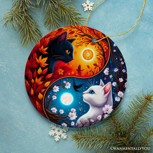 Mystical Seasons Yin and Yang Cats Ceramic Ornament, Gift for White and Black Kitten Lovers