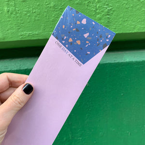 A 1980s Memphis-inspired paper list notepad featuring colorful terrazzo designs with subtle "One Day At A Time" sentiment.