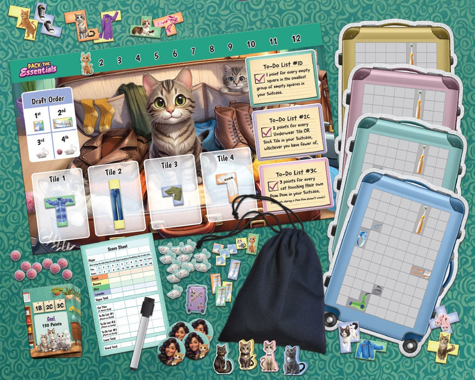 Every cat owner knows there is only one rule when packing for a trip - whether for business or pleasure, never forget to pack your cats! In Pack the Essentials, players take on the role of travelers who want to bring as many of their trusty felines with them as possible. Lure cats into your luggage with Pack Rat toys, do your best to fill your suitcase with matching colors, and make sure not to forget about your To-Do Lists before you head out the door! How many cats will fit in your suitcase? There is only one way to find out!