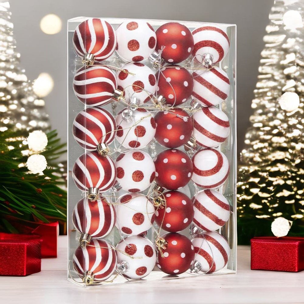 Infuse your holiday decor with a playful and festive spirit using our Polka Dot and Candycane Color Style Ornament Ball Bundle! This captivating collection features a delightful set of 24 red and white patterned Christmas baubles that effortlessly blend timeless charm with modern flair. Elevate your seasonal ambiance with these meticulously crafted ornaments, each capturing the essence of joy and merriment. Adorn your tree with these whimsical baubles that dance with polka dots and candycane colors, instantly transforming your space into a merry haven. Whether you're aiming for a classic Christmas or a contemporary celebration, these baubles promise to add a vibrant touch to your festive ensemble. Illuminate your festivities with the shimmering brilliance of these ornaments, and let your holiday spirit shine bright! 🎄🍭✨