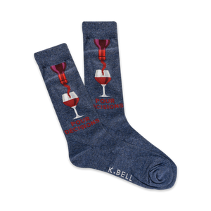 Pour Decisions wine socks: Prepare to spill your glass of humor with these Pour Decisions socks! Featuring a dark blue backdrop and a vibrant graphic showcasing a bottle of wine gracefully pouring into a wine glass, the phrase "Pour Decisions" playfully adorns the sides, inviting chuckles from fellow wine enthusiasts. Step into these crew-length socks meant just for men, and let the jolly wine-themed pattern remind you to laugh at life's "spirited" misadventures.