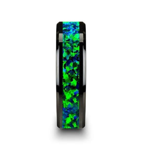 PULSAR Black Ceramic Wedding Band with Beveled Edges and Emerald Green & Sapphire Blue Color Opal Inlay - 6mm or 8 mm