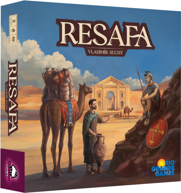 The game Resafa takes place during the 3rd century AD in the area of todays Middle East. Resafa now lies in ruins in modern-day Syria, but at this time it was a fortified desert outpost that flourished as a stop along important caravan routes. In the game, players represent merchants who travel on business trips and buy and sell goods in the various cities in the region. Resafa had no local sources of water, so it depended heavily on large cisterns to collect the spring and winter rainwater to make the area habitable. Players build water tanks and canals to distribute that water where it is needed. In the cities, they build workshops to help their businesses grow, which will allow them to collect resources and camels. They also construct gardens between the businesses, generating more resources and also victory points. The game is played over six rounds. In each round, a player takes only three actions, playing action cards in this tight and exciting game.