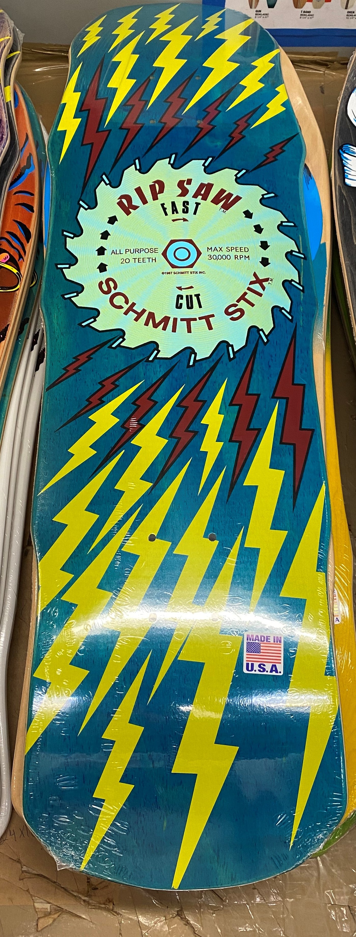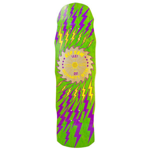This version of the Rip Saw graphic was originally released in 1987. The graphic is similar to the Rip Saw except it only features one blade and has lightning bolts coming off the blade. We're proud to reissue this board in a ton of colors. Check out those money bumps!