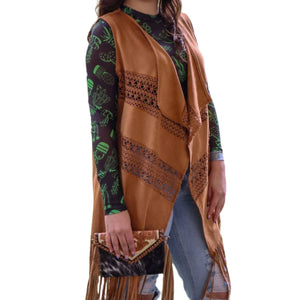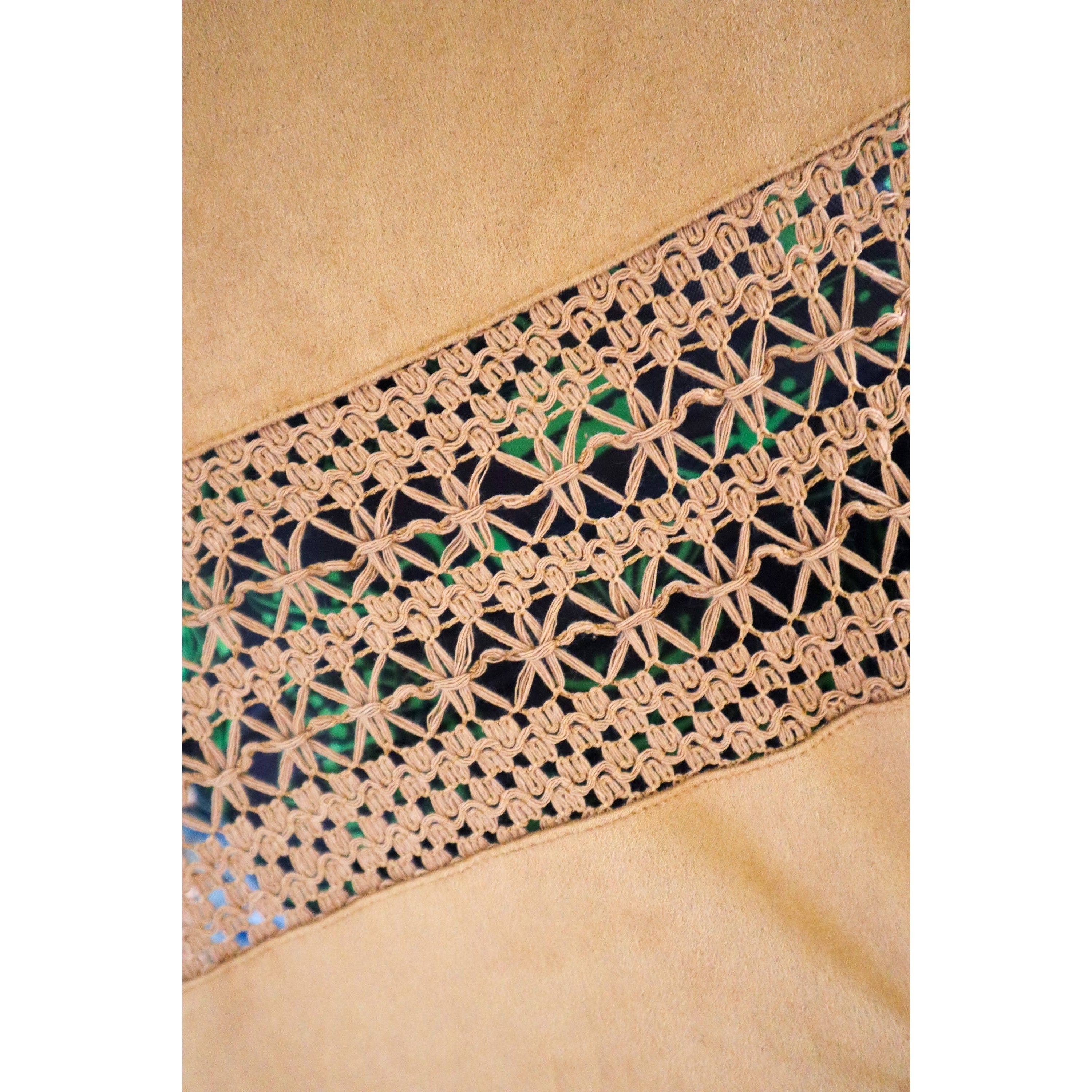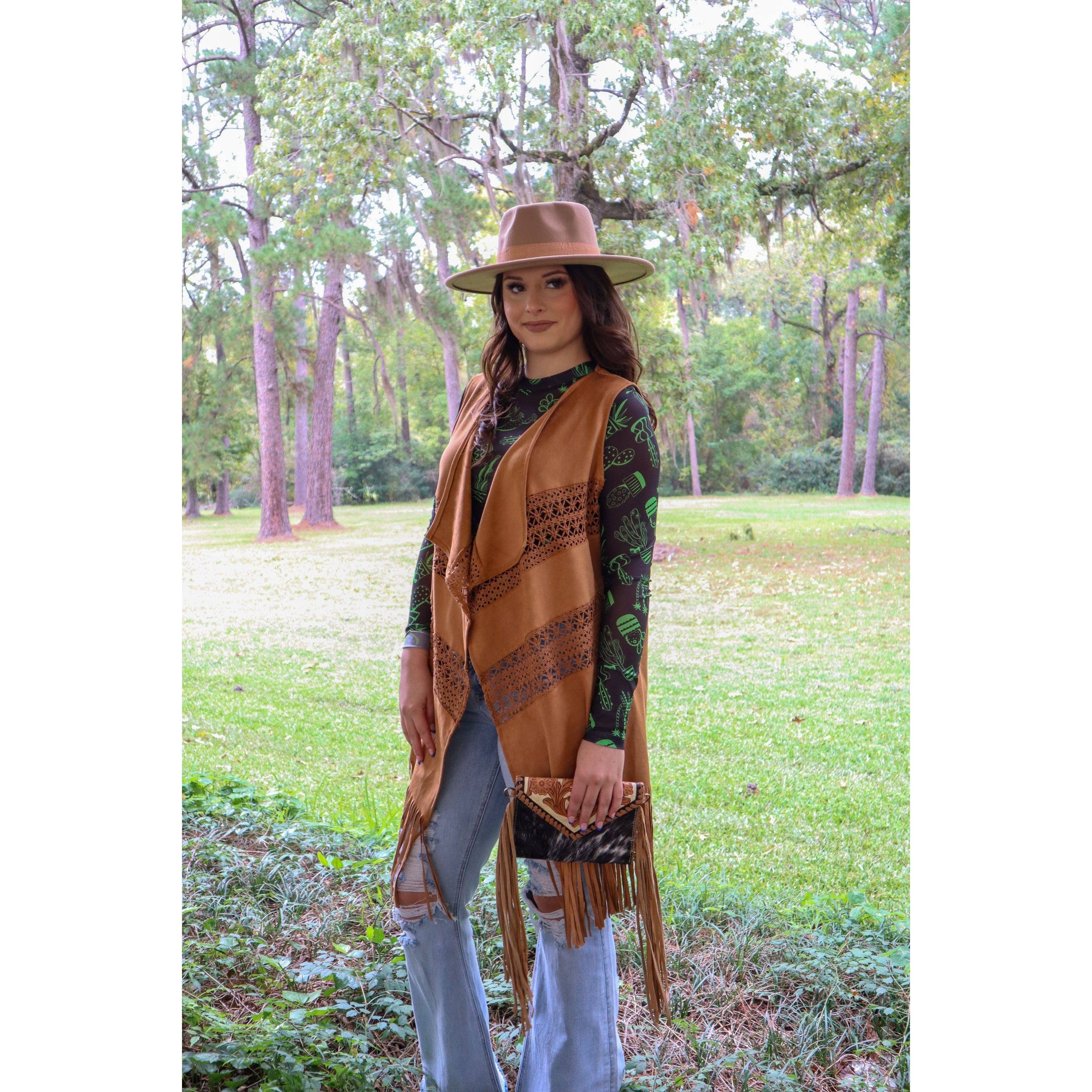Features: Vegan suede fabric, crochet accents, fringed bottom hem
