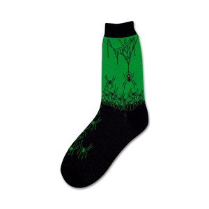 Spiders Allover: Crew socks for women covered in green spiders and cobwebs with red abdomens. Show your wild side with these spooky and cute socks. Pairs perfectly with a Halloween costume. Can you find all 3 secret spiders wearing hats?