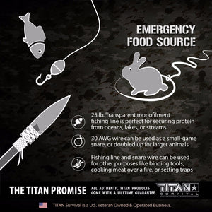 - 25 LB FISHING LINE - Includes a single transparent, 25 lb. test, high strength mono-filament fishing line that can be used when critically needed food is just yards away. This filament can also be melted and used to patch holes or used to bind tools together.