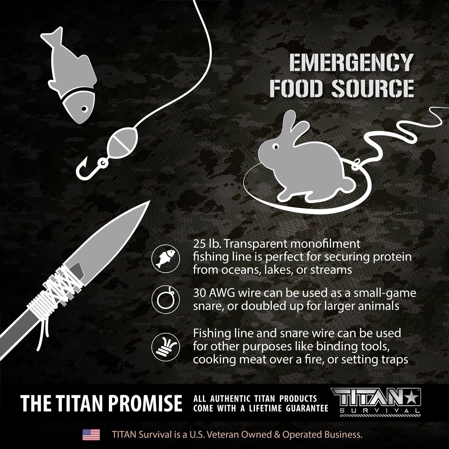 We're an American, Combat Veteran-Owned business, and all Authentic TITAN Survival products not only have a LIFETIME GUARANTEE, but a portion of all profits have gone to support Veterans' charities since 2013. And if you're unhappy with our products in any way, we will completely refund your purchase.
