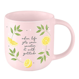 - Mug reads: "When life gets sour, sweeten it with gratitude" in black print