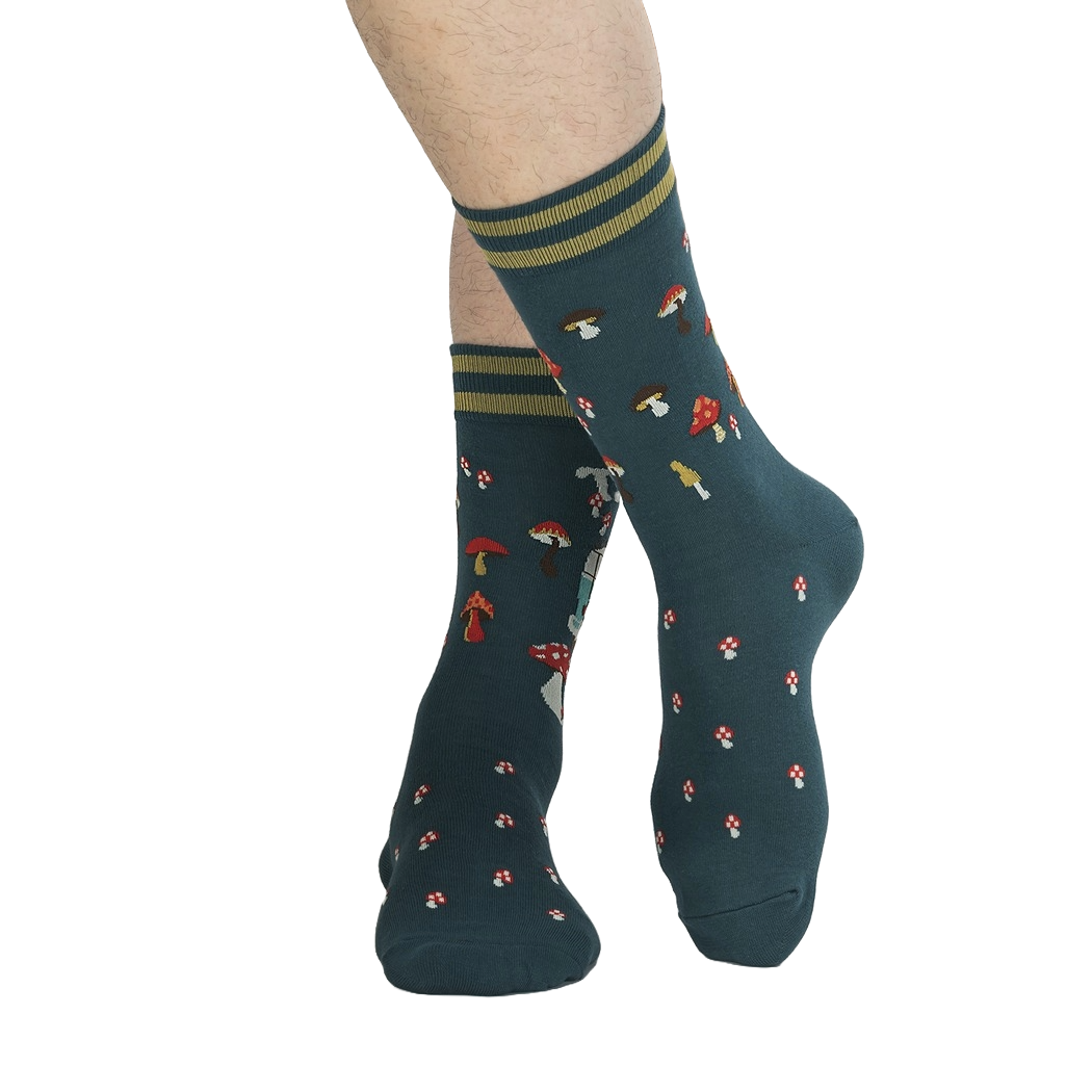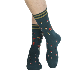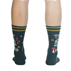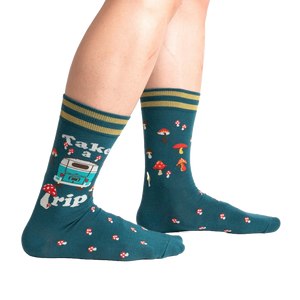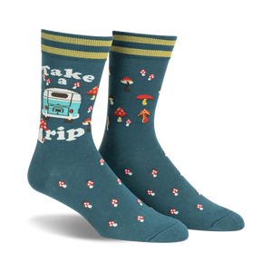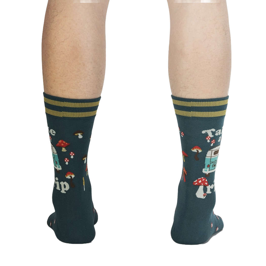 Get ready for an adventure with these funky camping socks! Featuring a dark teal background with red and white mushrooms, a light blue van with the words "Take A Trip," these men's crew socks are sure to tickle your fancy. Whether you're hitting the trails or just chilling at home, these socks will bring a smile to your face and keep your feet cozy. Made for those with a love for the outdoors and a sense of humor, these socks are perfect for adding some fun to your sock drawer.