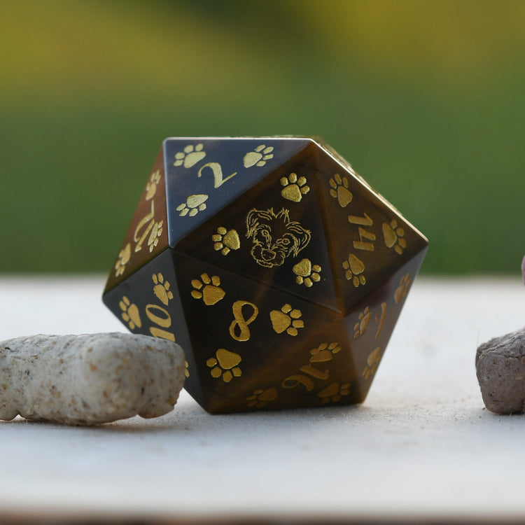 Every D20 is hand carved from gemstone. Designs are then engraved into each side and hand painted. Gemstone dice are never guaranteed to have a perfectly balanced weight; however, each of our dice sets are always well weighted and well balanced.
