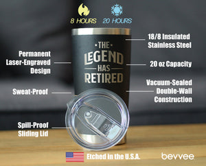 The Legend Has Retired - Insulated Coffee Tumbler Cup with Sliding Lid - Stainless Steel Insulated Mug - Funny Retirement Gifts for Boss or Coworkers