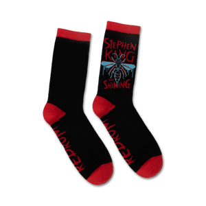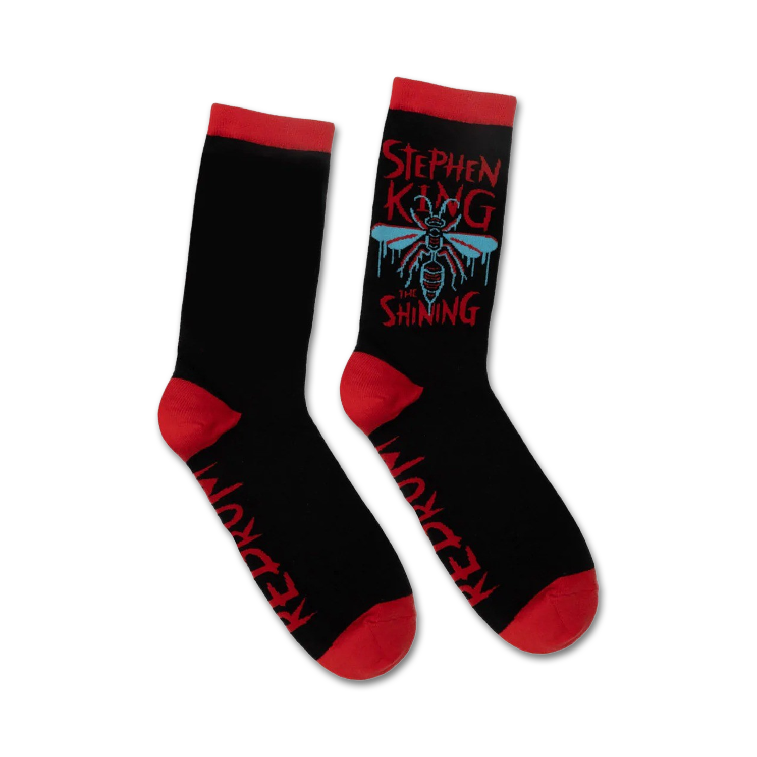 Step into the iconic world of Stephen King's "The Shining" with our black crew socks featuring a chilling pattern of red and blue axes on a black background. The striking red cuff and heel add a touch of drama, and the bold word "REDDRUM" written on the cuff will give you an edge like Jack Nicholson himself. These socks are a fun and unique way to show your love for horror and classic cinema.