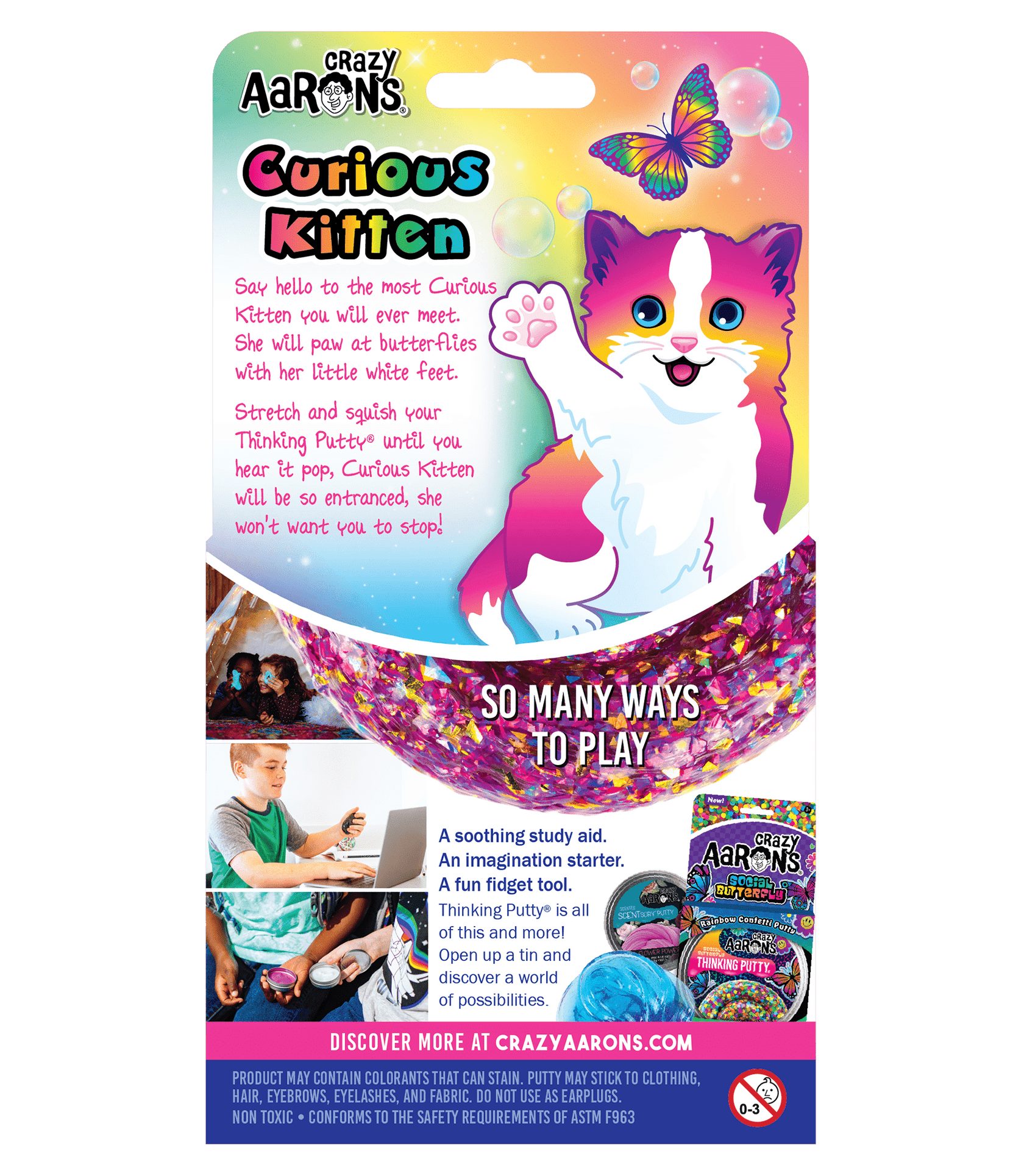 Say hello to the most curious kitten you will ever meet. She will paw at butterflies with her little white feet. Stretch and squish your Thinking Putty® until you hear it pop, Curious Kitten will be so entranced, she won't want you to stop!