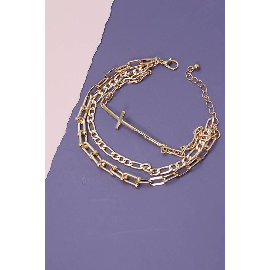 Triple Multi Bracelets with Large Cross Charm Pendant | Gold Tone Fashion Jewelry