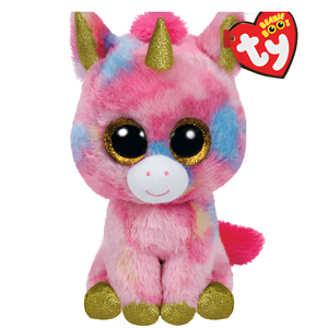 Magical dreams and wishes might make you think of me. I'm a beautiful plush unicorn with eyes all sparkly. I'm Fantasia the Beanie Boo, my hooves are gold, my horn is too. Pink, blue and yellow with a touch of white, I really am a wonderful unicorn, a truly colorful sight.