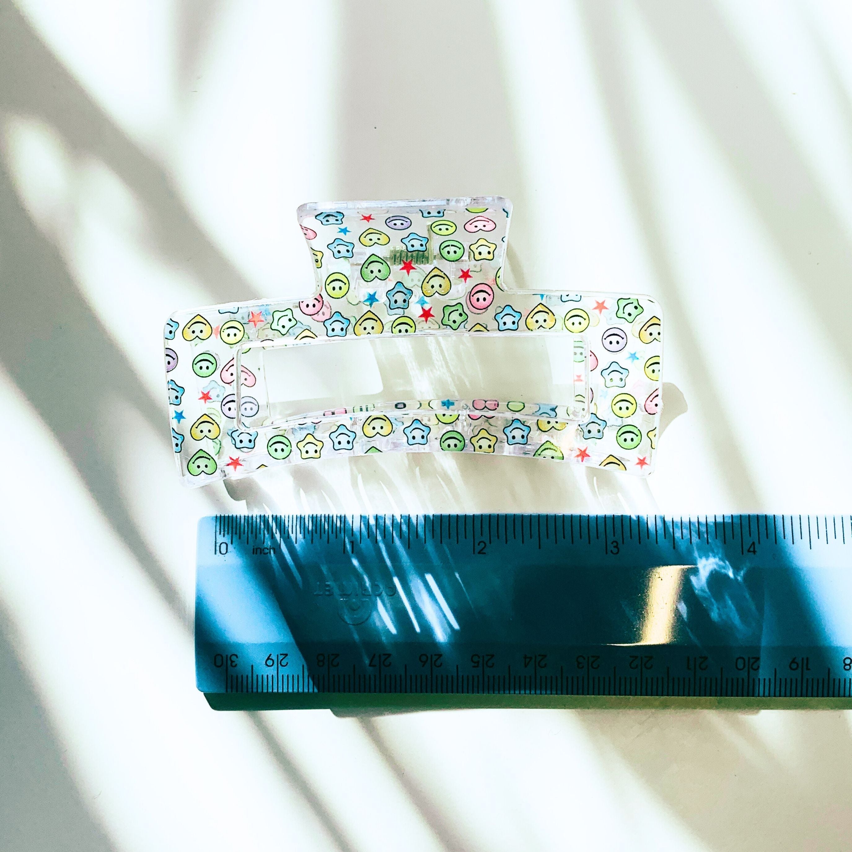 Get ready to spice up your hairstyle with cute smileys, stars and hearts embellishing this beautiful hair claw!