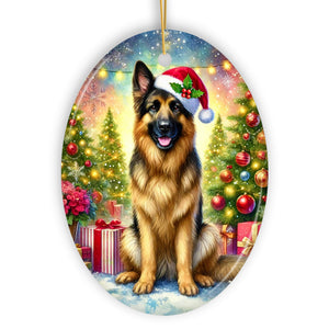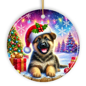 Brighten your holiday decor with this adorable German Shepherd puppy ornament! Decked in a festive Santa hat and framed by sparkling trees and vibrant gifts, this cheerful pup embodies the warmth and joy of the season. Perfect for dog lovers, it’s a heart-melting addition to any Christmas tree.