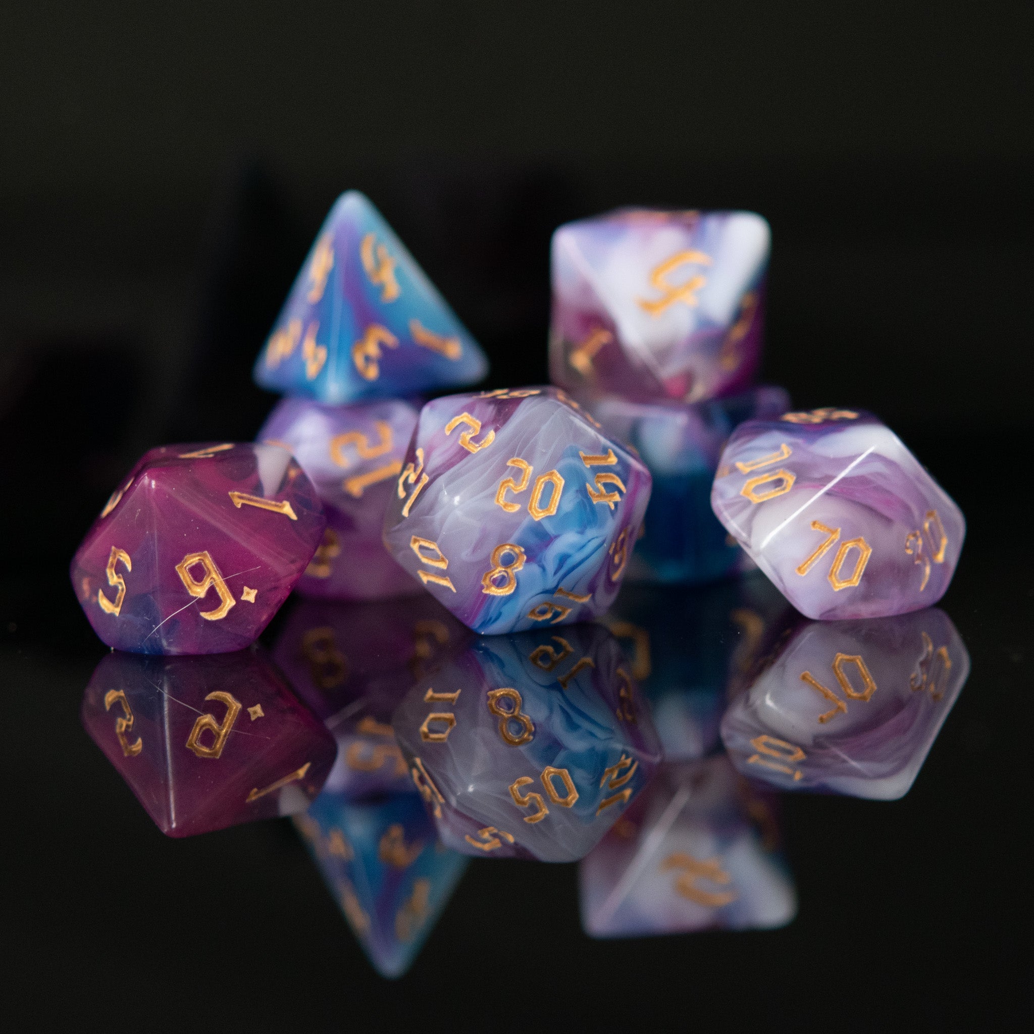 Our acrylic dice are carefully poured into individual molds and cured inside a vacuum chamber to insure no air bubbles are trapped inside the dice. After curing, each individual die is removed from the mold and numbers are painted by hand. These dice are perfect for any RPG and will sure to impress at your upcoming session!