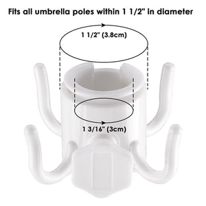 Beach Umbrella Hanging Hook features a screw thread fastening system designed to fit all umbrella poles within 1 1/2" in diameter, suitable for use with beach umbrellas of all types and sizes