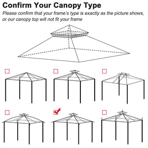 - As the gazebo size varies, please check your gazebo and the Product Details above carefully for best match. It will fit better if the gazebo frame is a little smaller than the top. Please confirm that your frame's type is the same as shown in the picture and measure the frame size before buying.