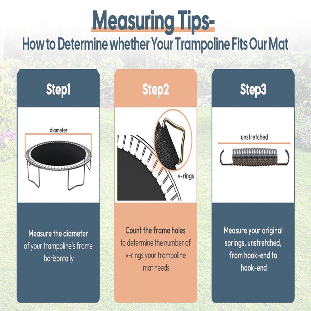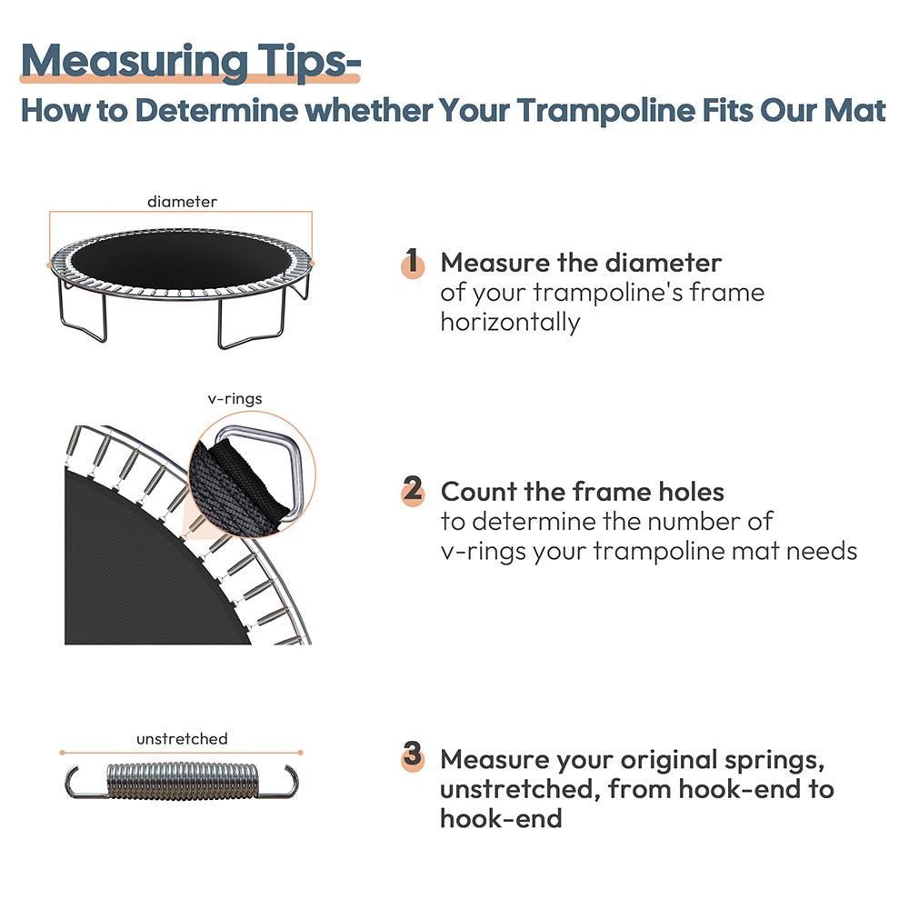 Notice: Please make sure that your trampoline is compatible with our mat's size, number of v-rings, and spring size at the same time, otherwise the mat might not fit your trampoline