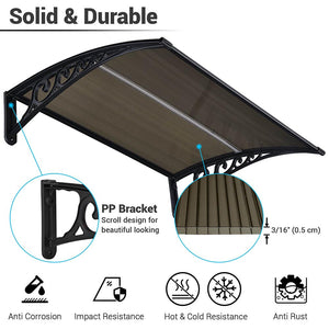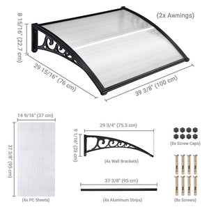 Yescom 3ft Awning Set of 2 is made with hollow polycarbonate sheet with UV protection and strong plastic alloy brackets that can protect your entry doorway or windows. Synthetic materials Awnings can easily be trimmed to your required width. This awning have good weather resistance, safe, easy and ready to install.