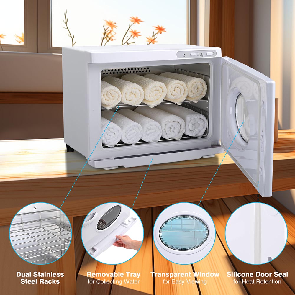 - Features 23L large capacity with dual racks for holding plenty of towels, integrating heating function & UV light