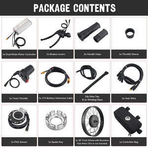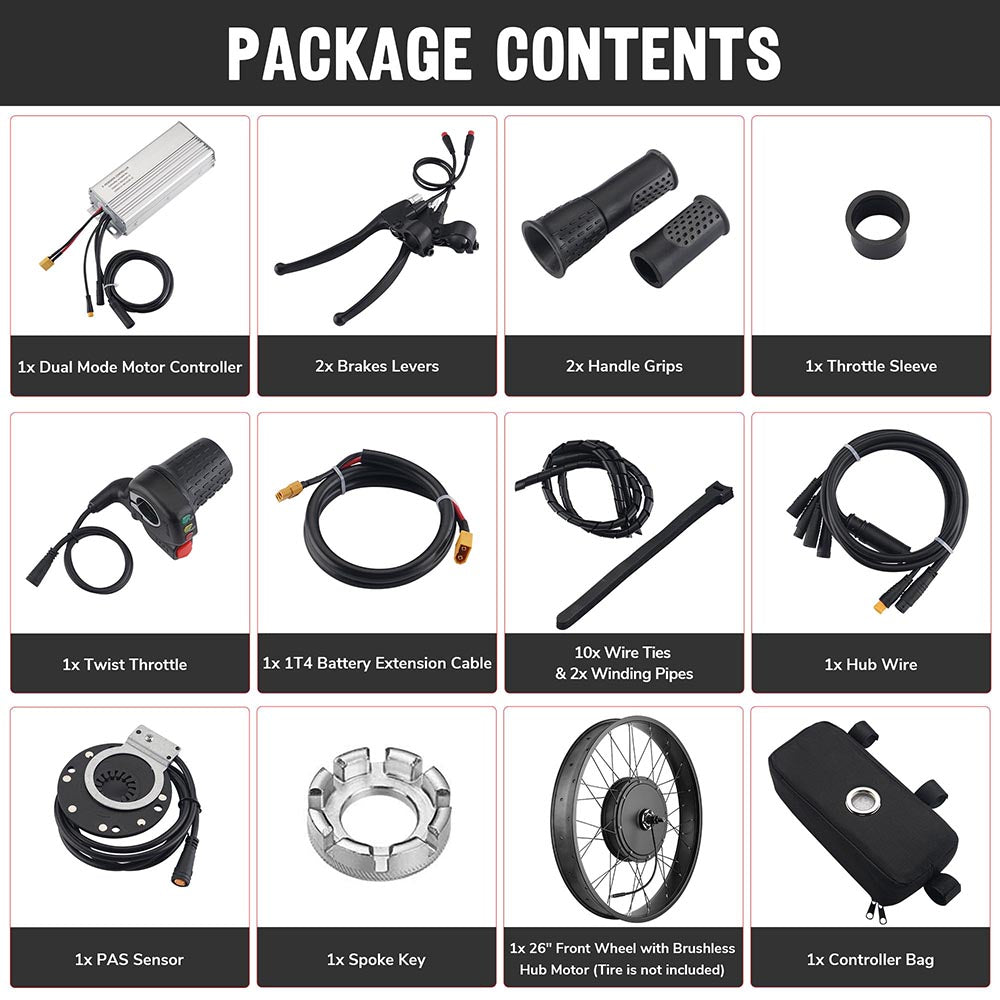 Yescom Electric Bicycle Motor Front Wheel Fat Tire Kit, includes 26" motorized wheel(not includes the tire), 48v 1000w motor, speed throttle, power break lever, wire harness, pedal assist sensor, etc. The powerful motor allows the speed up to 28 MPH (45KM/H). Fit for 5 5/16" front dropout spacing and 26"x4" tire