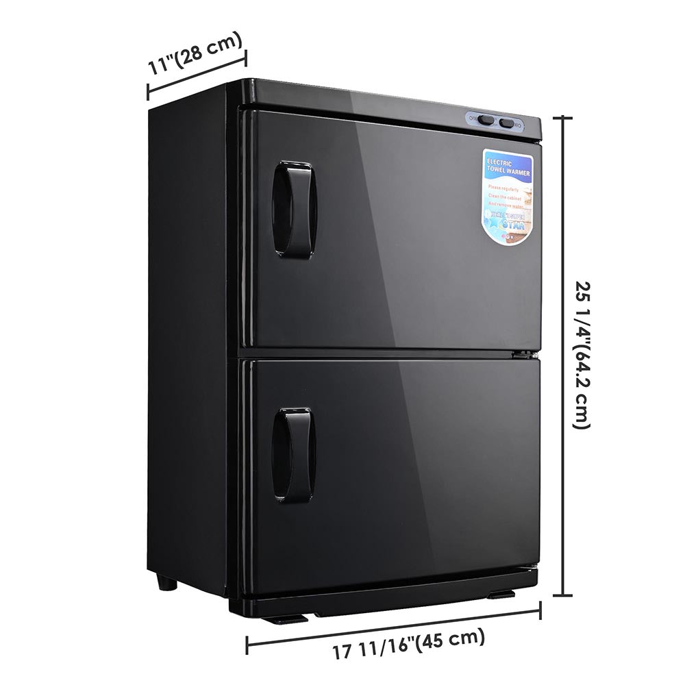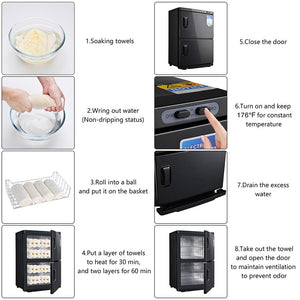 46L Capacity for placing up to 24 facial towels per cabinet(total 48 towels), ideal for cleaning a lot of towels at a time and improving efficiency for meeting the need of commercial use. Built-in UV Sterilizer and fast heating function which can heat up to 176°F in 30 minutes.