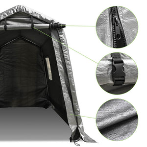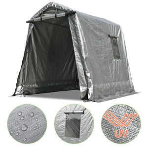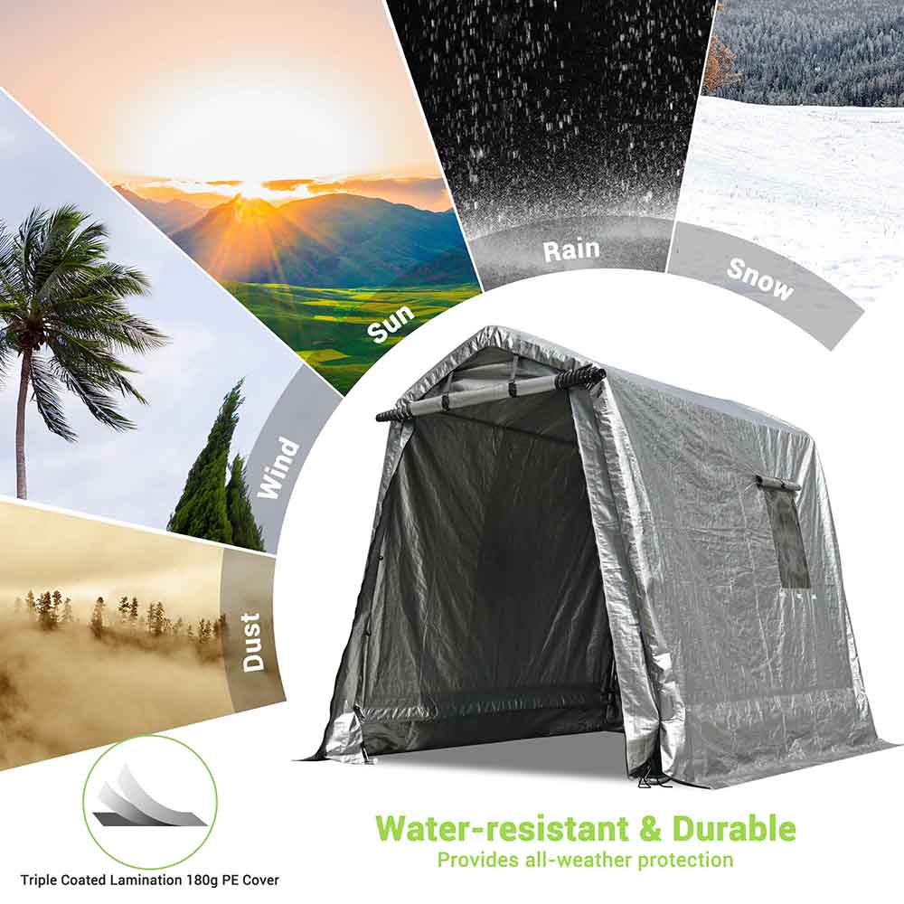 6x8 ft Outdoor Storage Shed features all-steel metal frame and UV-treated polyethylene cover and includes one accessible zippered door for privacy, an excellent storage solution for your items such as snow blowers, bikes, ATVs, pool items.