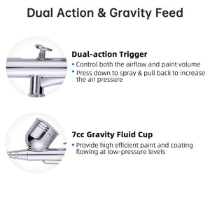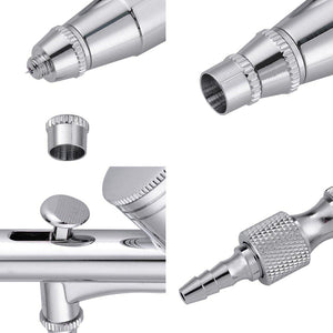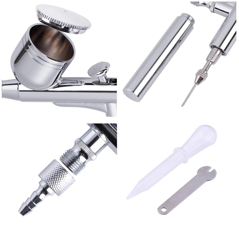 This Professional Precise Airbrush includes 0.3mm Nozzle Dual-Action Gravity Feed Pattern with 7cc Fluid Cup plus Dual-Action Trigger Air/Fluid Control. Our recommended applications are Nail Art, Beauty Makeup, Fine Art, Hobbies, Crafts and more. This airbrush is ideal for large art work, spraying tanning, cake decoration, large art illustrations, tattoo applications.