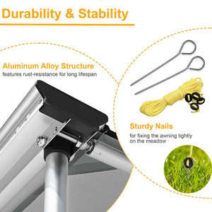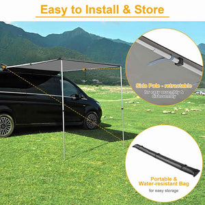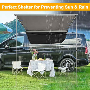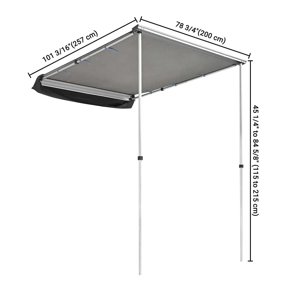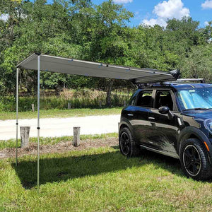 Yescom Sand/ Gray Colored 6' 7" x 8' 2" Vehicle Rooftop Side Awning Shelter is retractable which easily can cover 30sq.ft area to shield from sun, rain, and wind. It is Made of 420D oxford fabric with 2000mm PU coating, UV50+ protection and water resistance. Telescoping poles with twist-lock design, quickly extend and collapse, provide quick and simple setup and tear-down. Suitable for camping, picnics, car travel and other outdoor activities.