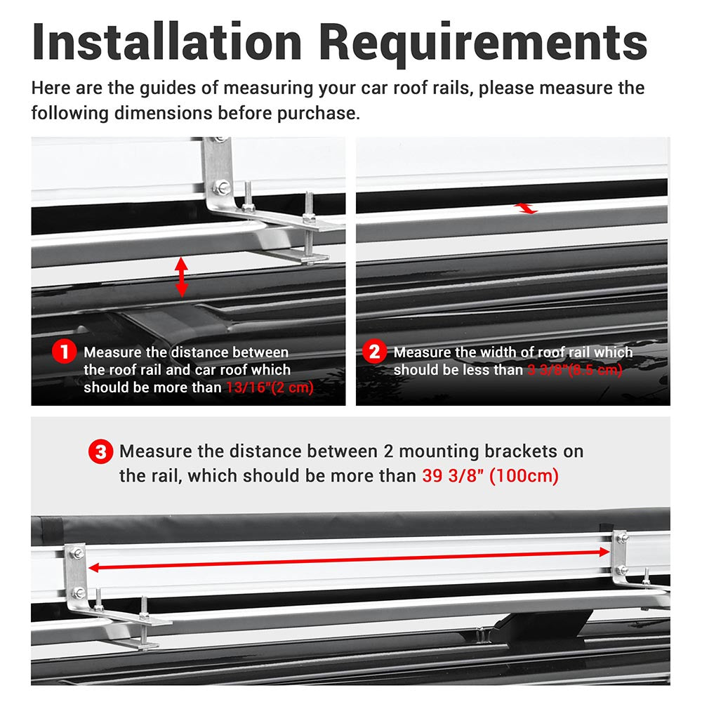 - Distance Between Roof Rail and Car Roof: ≥ 13/16" (2 cm)