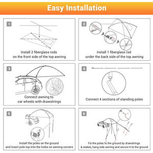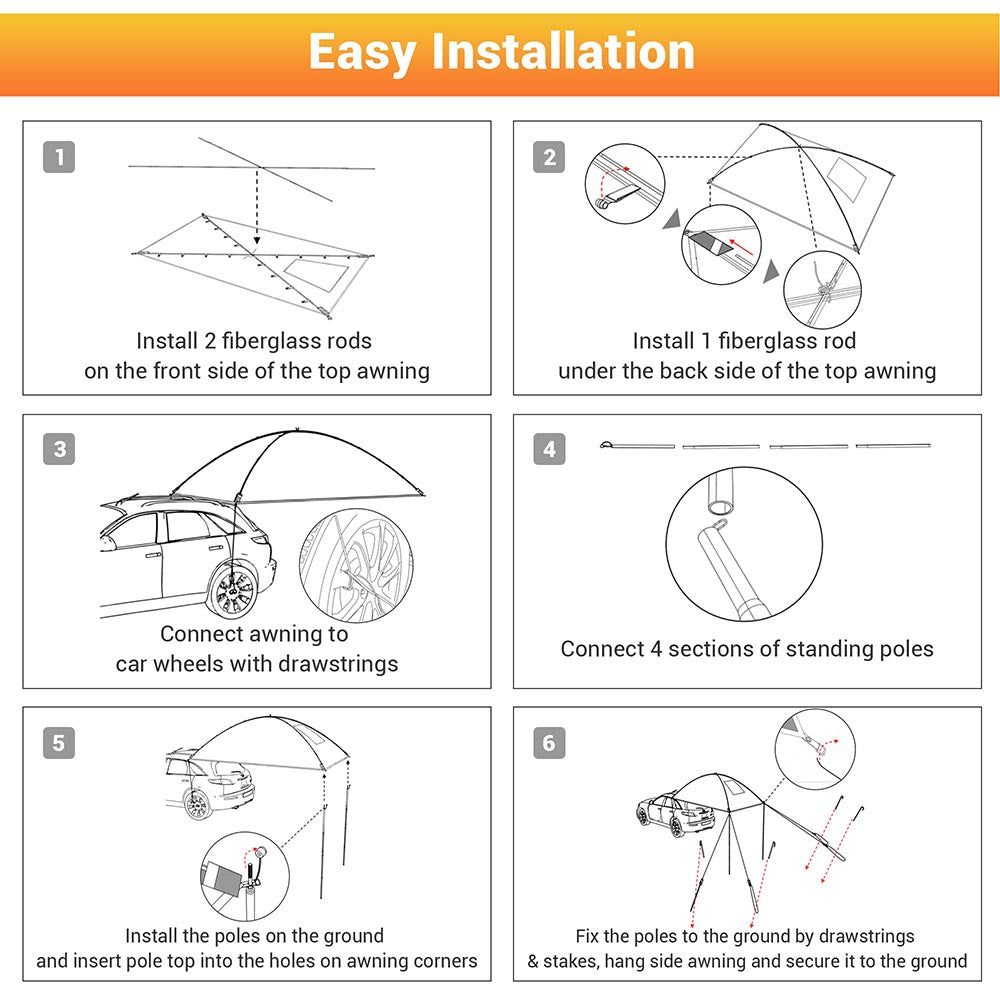 - No tools needed, easy to install the awning and secure the awning on the ground by stakes and ropes