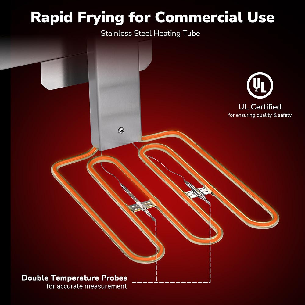 - 7200W high-power fryer with long U-shaped heating tubes provides fast heating for frying large batches of food quickly