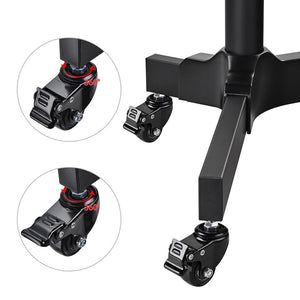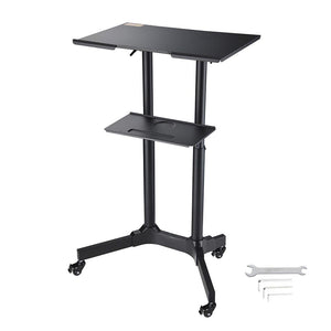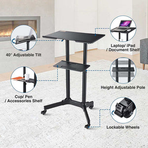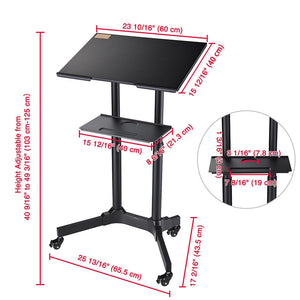 26" x 17" x 49" Portable Podium features height & tilt angle adjustment for fitting different people and making it to be a sit or stand-up podium, along with 4 rolling wheels for adding movability. It is ideal for home office, classroom, lecture hall, studio, meeting room, etc.