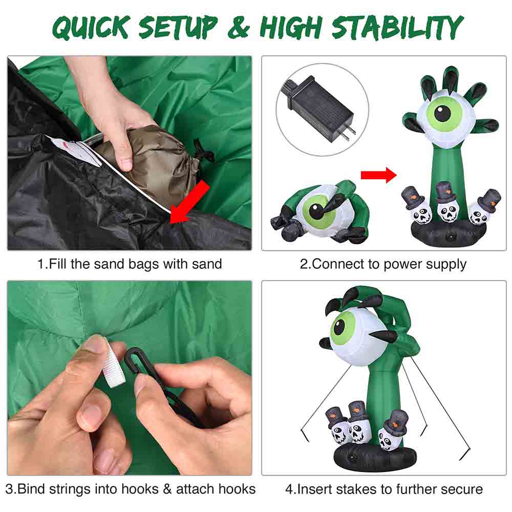 Mike Wazowski Halloween Inflatable Monster Hand with Eyeball Blow Up Inflatable LED Lights Decor makes motion activated scary sounds and lighting effects for creating a spooky display in your backyard, coming with stakes and tethers for secure installation.