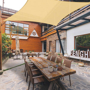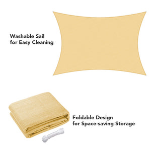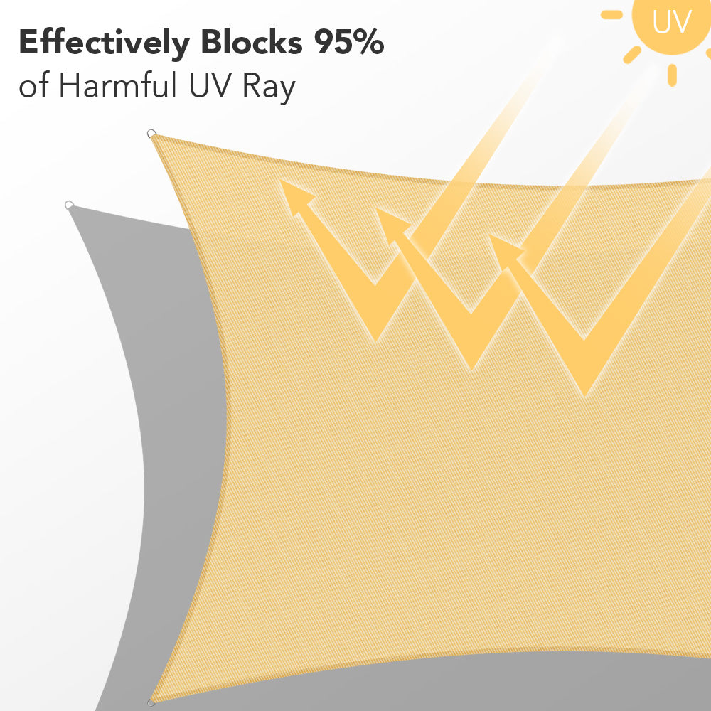 This 13' x 19' Rectangle Sun Shade Sail, made of new high density polyethylene material, can block 97% ultraviolet rays, effectively reduce heat transfer, and allow breeze to pass through, creating a comfortable environment in outdoor courtyard or terrace, and reducing exposure to protect your skin. It is very convenient to install and can be cleaned.