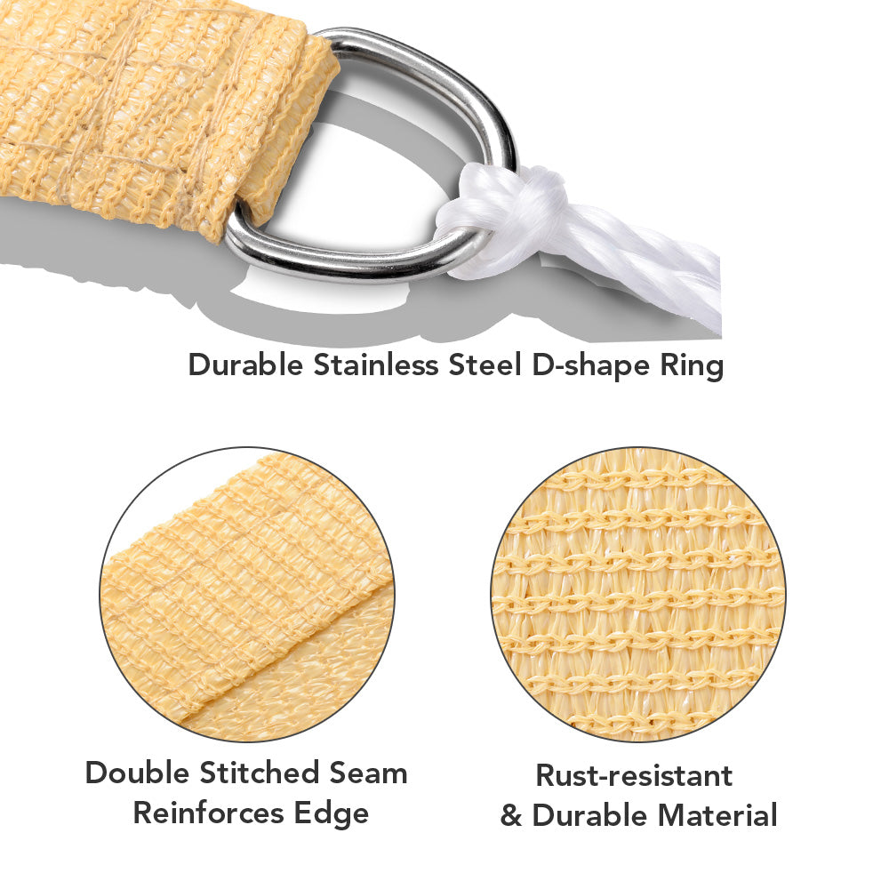 - Durable in Use - Double stitched seam reinforces the edge to prevent fraying and ripping; Curved rectangle shape helps the sail to keep tight; Heavy-duty nylon ropes included; Antiager composition added for long time service