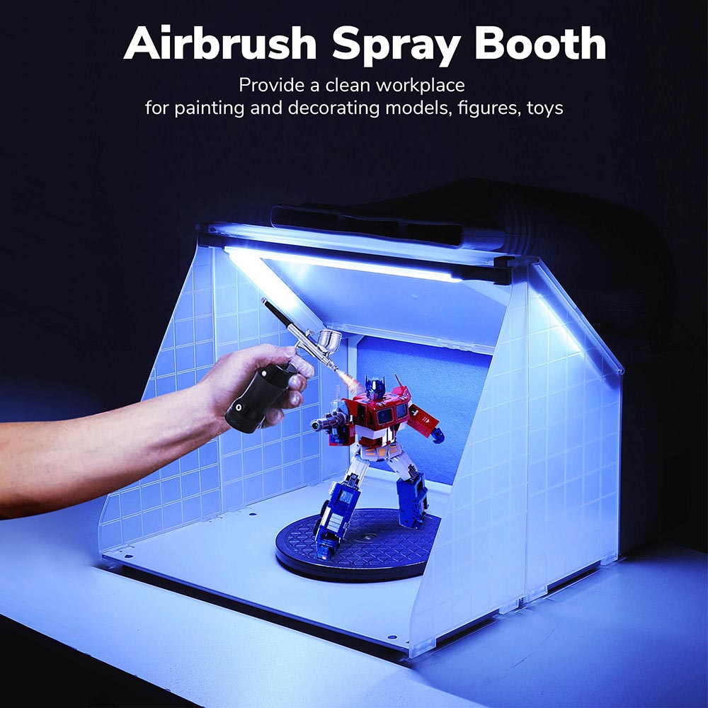 Airbrush Paint Booth Kit with 3 LED lights can offer sufficient lighting. It features a high-efficient fan and an extension hose to reduce paint fumes, providing you a clean and safe workplace to make DIY creation. It's ideal for painting and decorating models, toys, cake, crafts, nail art, etc