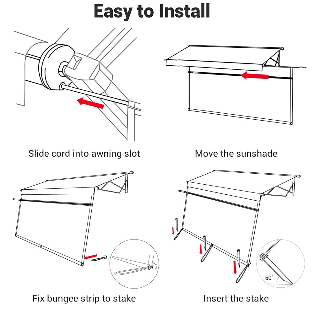 - Easy installation by sliding the cord into awning slot and moving the sun shade