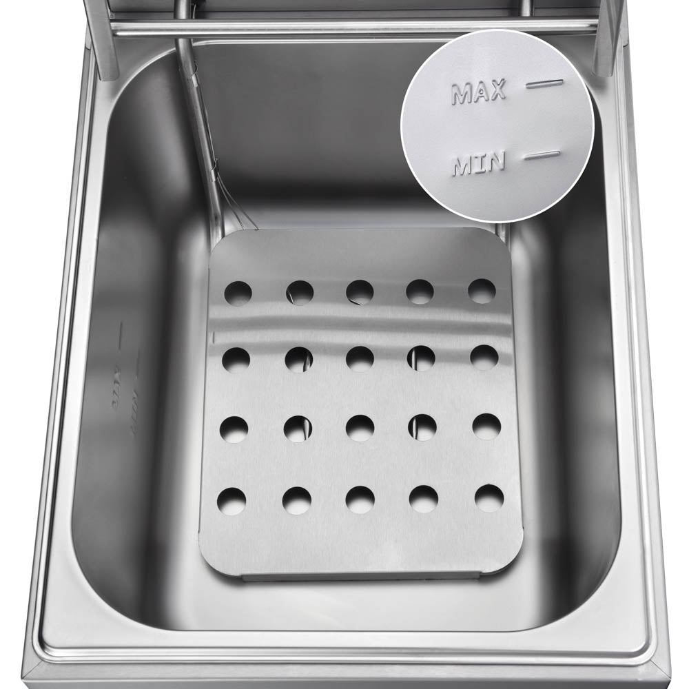 - Operation Safety - Configured lid prevents spilling of boiling oil, while the frying basket with a plastic handle prevents you from getting burnt
