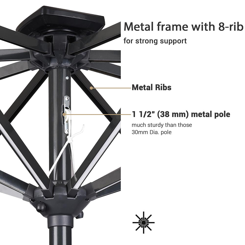 Yescom 10 ft. Upgraded Patio Furniture Umbrella with 8 Ribs LED lights, helps you to be effectively protected from sunlight and drizzle. It has a tilt system to flexibly adjust the shielding position. It will save energy by using the solar system.