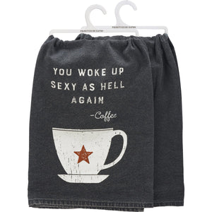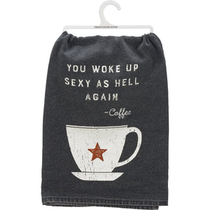 A black cotton kitchen towel featuring a distressed "You Woke Up Sexy As Hell Again - Coffee" sentiment with rustic coffee cup featuring a star design.